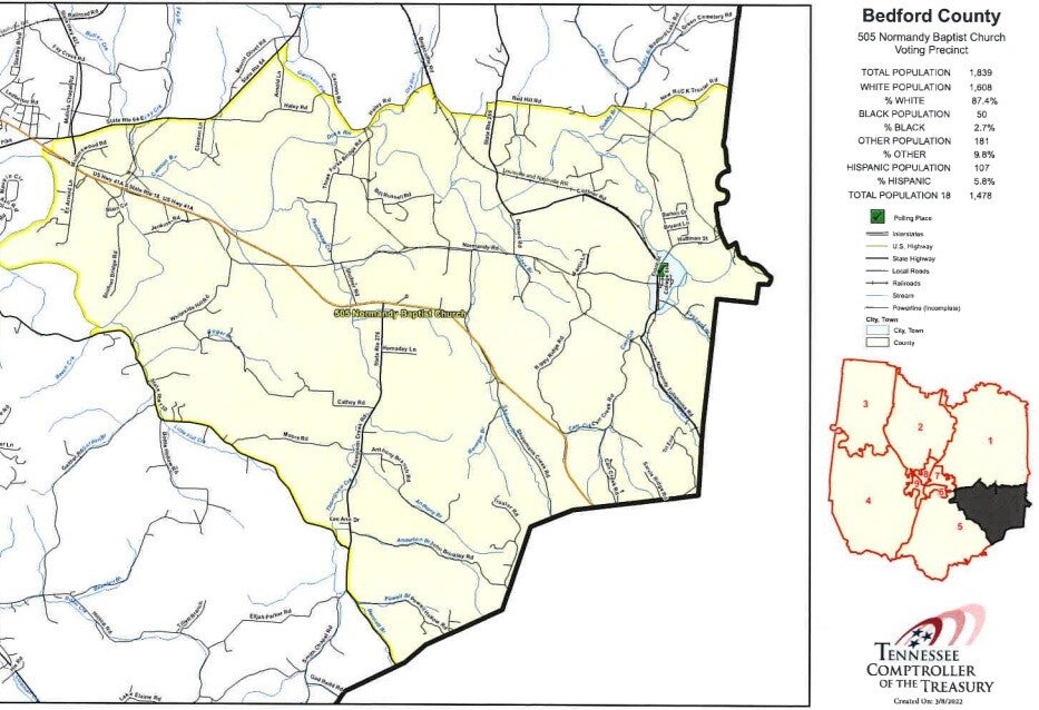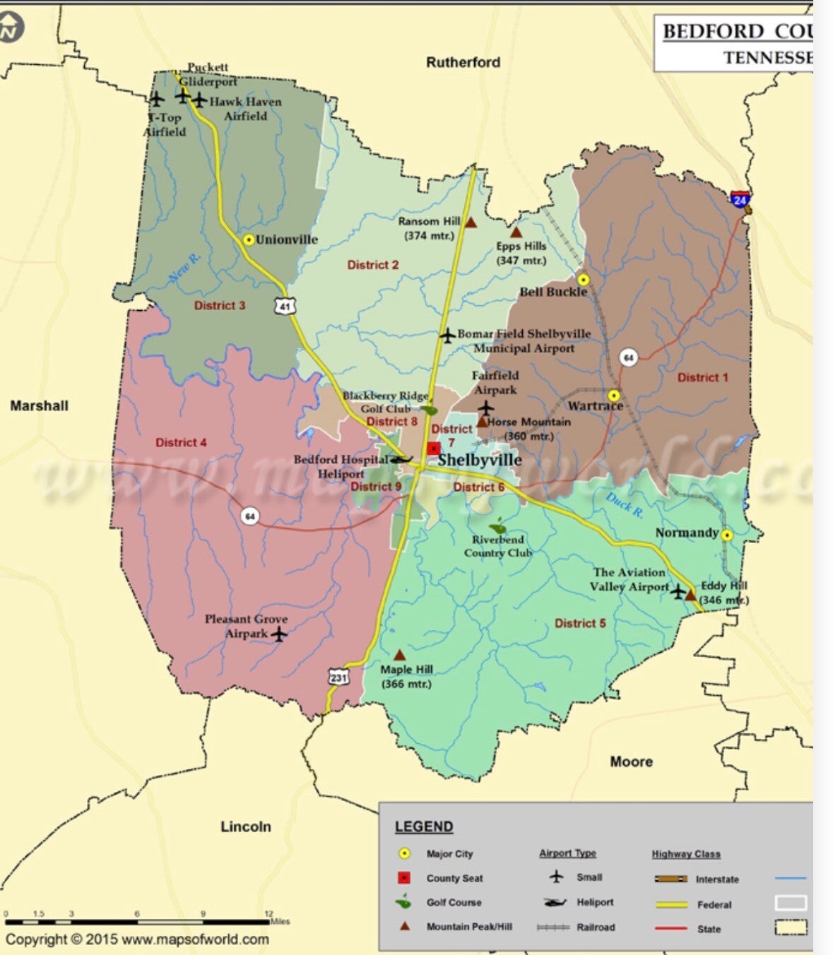 The Fifth District of Bedford County is located in the county's southeast quadrant. While it is one of the largest districts by land area, it is less densely populated than some surrounding neighbors. The district contains two voting precincts, Flat Creek and Normandy; however, the area encompasses several distinct communities, including Raus, Singleton, Haley, the Country Club, and the Tollgate area.